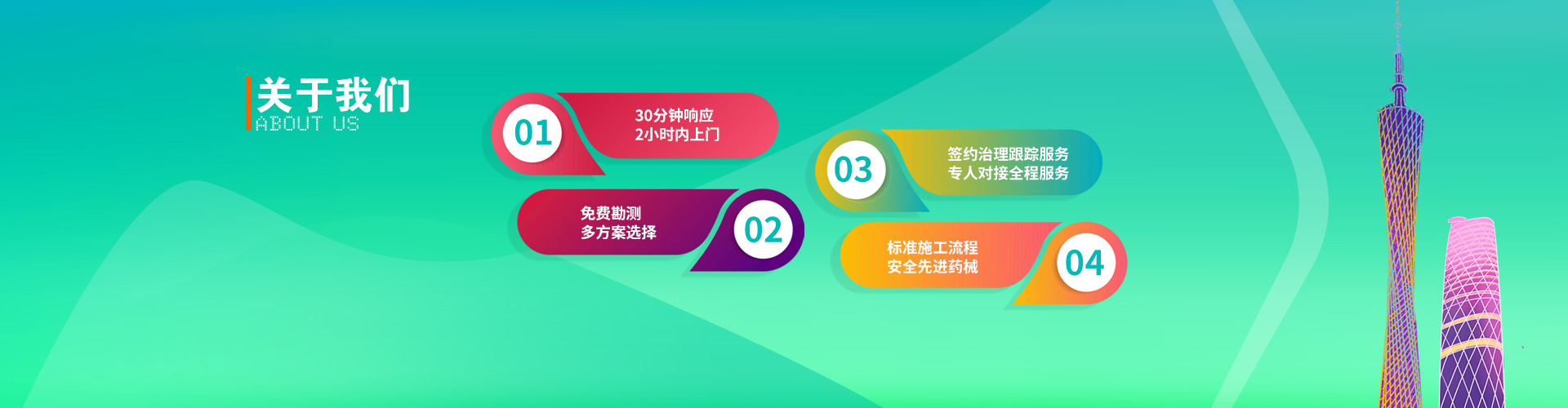 廣州(zhōu)花样直播白蟻防治有限公司 ® 前身是廣州白蟻(yǐ)防治所旗下的一所老牌白蟻防治公司,隨著社會的快速發展和國家政策的變化,2015年重新注冊命名為廣州花样直播白蟻防治有限公司。 廣州花样直播白蟻防治(zhì)從(cóng)事白蟻、四害等城市害蟲預防與治理。擁有一(yī)批從事白蟻防(fáng)治的專家、技術(shù)顧問、專業工程師及專業技術(shù)施工人員,主營園林綠化、新建、改建、擴建、裝飾(shì)裝修、等(děng)房屋的白蟻防治工程;專業提供白蟻防治、熏蒸 殺(shā)蟲施工服務及谘(zī)詢;我們擁有雄(xióng)厚的技術力量、豐(fēng)富的實踐(jiàn)經驗、規範的管理、嚴格的施工(gōng)和複查跟(gēn)蹤製度,確保治理和預防質量(liàng);竭誠(chéng)為廣大客戶提供優質、高效(xiào)的服務。 我們將始終堅持" 安全與質量並重(chóng),誠信服務" 的理念,以先進的技術和科學的管理為客戶提供優質的技術工程(chéng)服(fú)務。